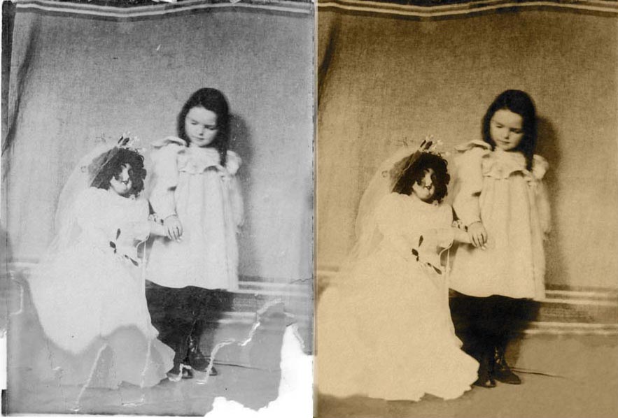 The "dust and scratch" Photoshop programs don't work because they remove too many details, and result in a fuzzier photo than the original. So cleaning up the photos is a matter of removing each speck and scratch by hand. Others need color correction. Then occasionally more major repairs are needed.